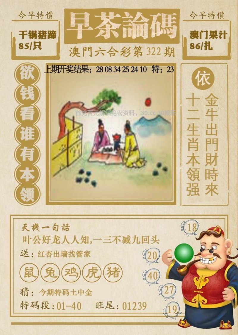 | 322期:早茶论码 解释:叶公好龙人人知,一三不减九回头 综合9肖:蛇龙羊猴鸡鼠猪牛狗 越前越主,以上分析只代表个人理解,对错勿怪 |
