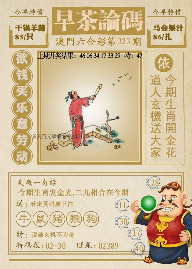 | 323期:早茶论码 解释:今期生肖发金光,二九相合在今期 综合9肖:蛇龙鼠狗虎马牛鸡兔 越前越主,以上分析只代表个人理解,对错勿怪 |